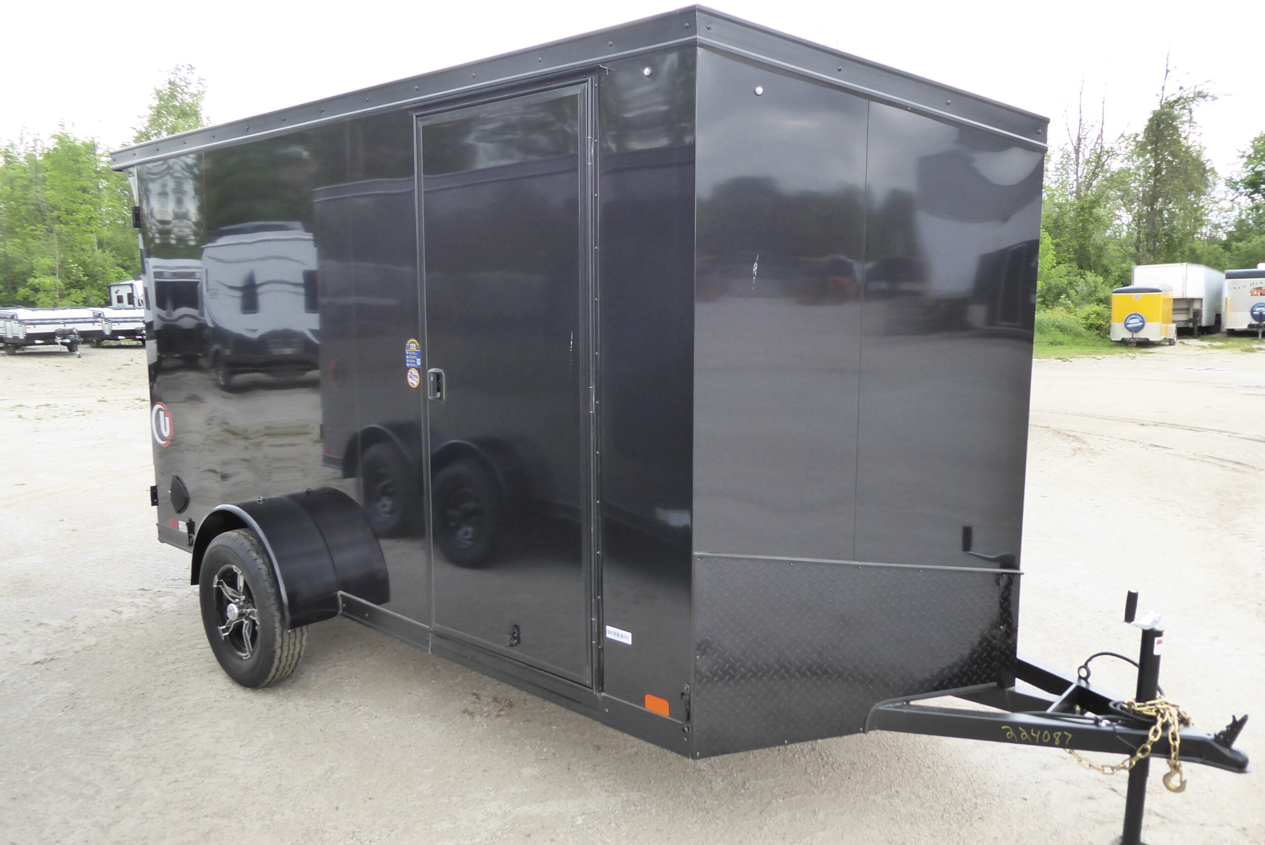 2025 UJ 6 X 12 Stock #4087, Black-out Package, Barn Door, Rear Stabilizer Jacks, 24˝ Stone Guard, Steel Unibody Construction, Protective Undercoating, 2” Coupler, Tongue Jack , Aluminum Fenders, 3000lbs Dexter 4˝ Drop Torsion Axles with E-Z Lube Hubs, 3/8” Plywood Walls,  3/4˝ Plywood Floor, 4-Bolt-in D-Rings, 16˝ Ceiling, Walls, & Floor, 6’ 6” Interior Height .030 Taped Exterior (Screwless), 15˝ Radial Tires with Alum Wheels, 12 Volt Dome Light with Switch, 32” Side door, LED Lights, Colour Black
