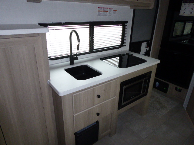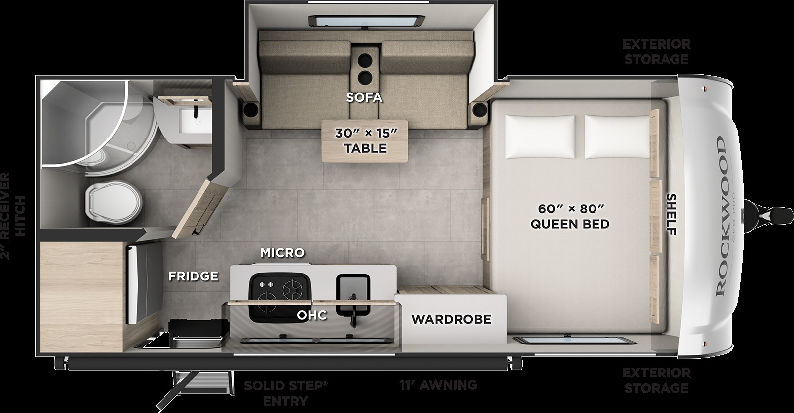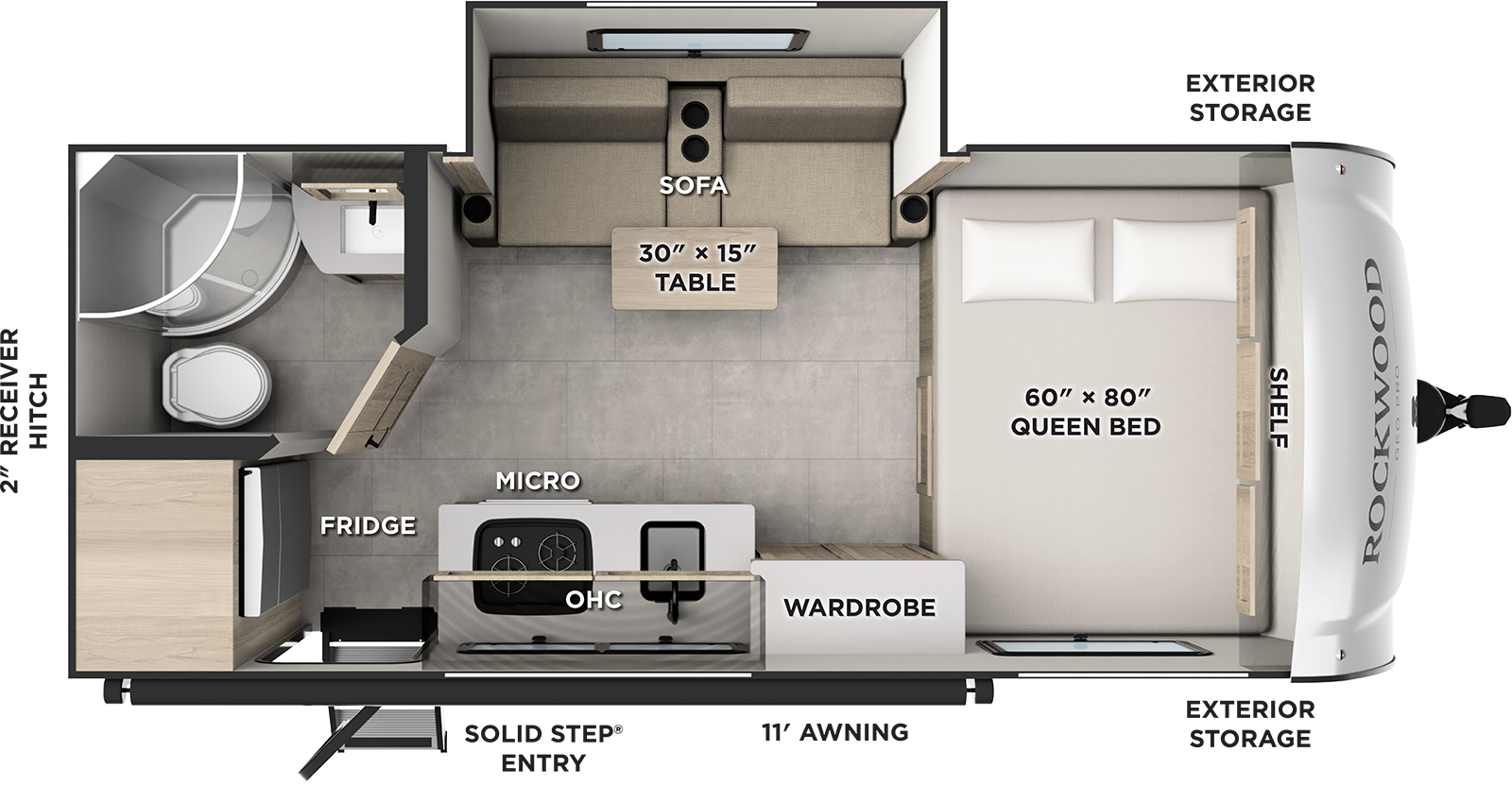 | Floor Plan Features Length: 20’ Weight: 2,928lbs Sleeps: Queen Bed 60”x80 | Also Included at Terry’s Trailer Service Full Propane Tank New Battery $150 in Store Gift Card Full Demonstration (Set-up to Pack-up) License plate and Registration | Appliances 2-Burner Cooktop with glass cover Roof Mount A/C Gas/Electric water heater 20,000 BTU Furnace 12V Fridge Microwave