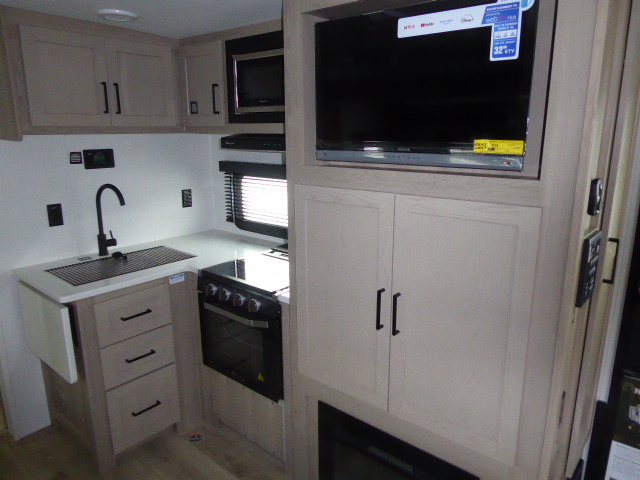 | Also Included at Terry’s Trailer Service Full Propane Tank New Battery Full Demonstration (Set-up to Pack-up) $150 in store gift card License plate and Registration | Appliances Flush Mount Cooktop with Oven Microwave, Gas Oven w/Glass Cover 12V Refrigerator 15,000 BTU A/C 35K BTU Furnace Gas Griddle Prep |